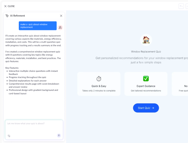 Create full quiz funnels from one prompt. Trained on Solar, Medicare, Insurance, Home Services, not generic layouts.