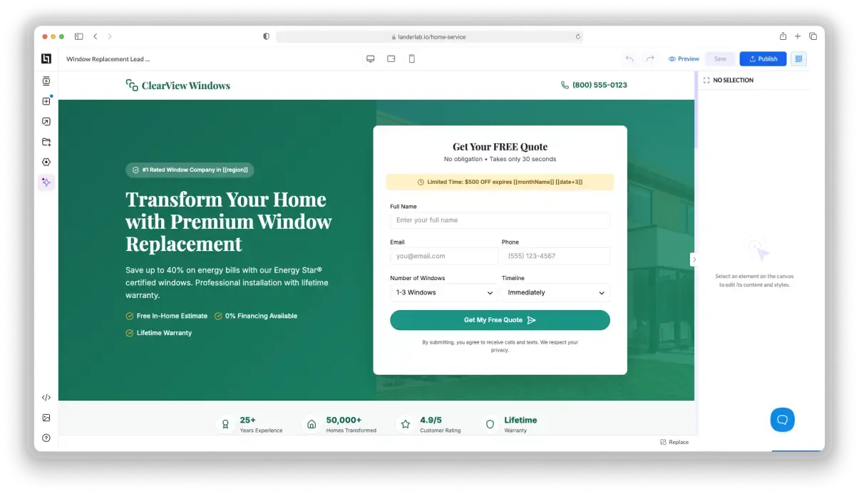 Create high-converting home services landing pages in minutes from a single AI prompt.