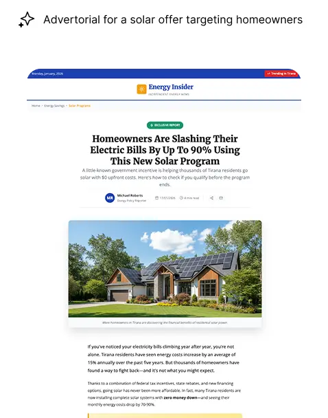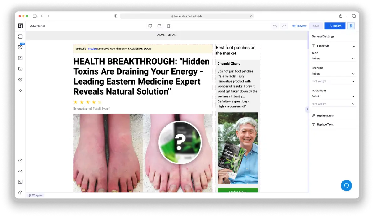 Create multiple advertorial versions and test hooks, section order, CTAs, or layouts without extra tools.