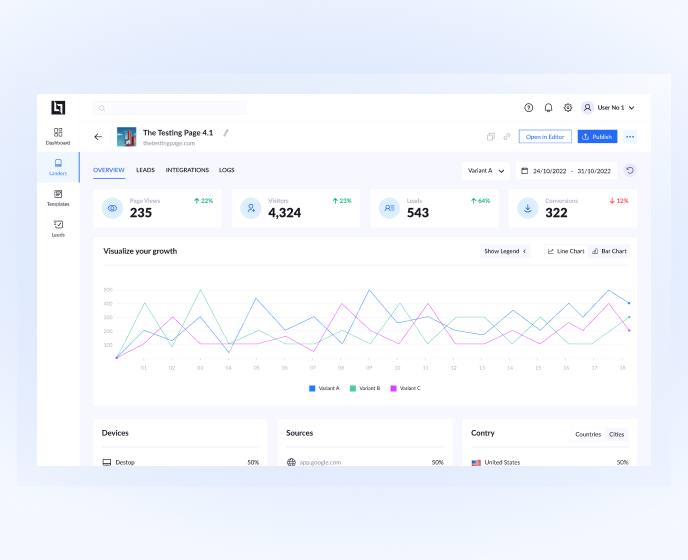No need to juggle third-party tools—you can see all your test results right here on LanderLab. Whether you're editing one page or comparing two totally different designs, all tests run on the same URL. This keeps things simple and ensures you comply with big ad platforms like Google Ads and Meta.